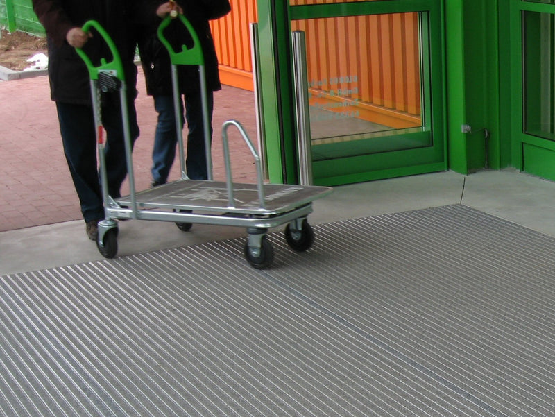 Für wirklich hohe Belastungen sind die Eingangsmatten der Stabil Serie genau die Richtigen. Die Stabil Eingangsmatten empfehlen wir Kunden die eine besonders hohe Belastung im Eingangsbereich haben. Hubwagen und Warenanlieferungen auf Rollwagen oder ähnliches, die Alu-Profilmatten Stabil in 23 mm halten auch diesen extremen Belastungen stand.