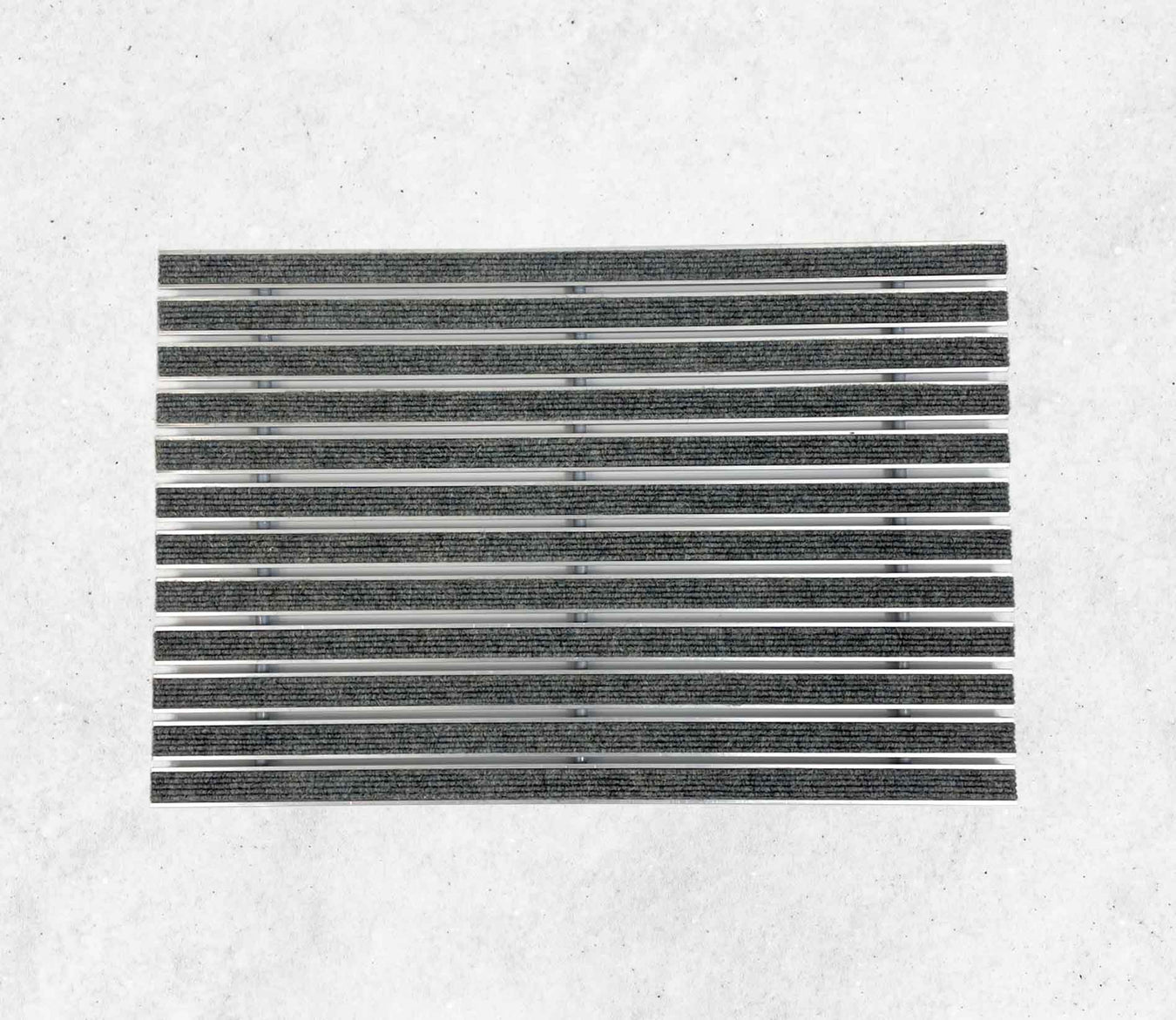 Schwerentflammbare - Aluminium - Eingangsmatten für die aufliegende Verlegung im Innenbereich. Die gesammte Eingangsmatte wurde vom Materialprüfungsamt NRW DIN EN 13501-1 Bfl S1 eingestuft, nicht nur der Nutzbelag! Aufrollbar durch Edelstahl-Verbindungsseile. Nutzbelag Rips: ca. 40% Polyamid ca. 60% Kaschmir-Ziegenhaar. Der Nutzbelag ist vollflächig mit Kontaktklebstoff verklebt. Trittschalldämmung durch TPE Gummiprofil an der Unterseite.